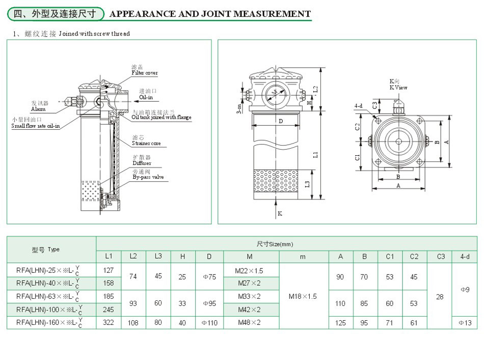 只需旋開過濾器濾蓋(清洗蓋)即可更換濾芯或向油箱加油,并在濾頭設有2只M18×1.5油口,可在任何一方安裝發(fā)訊器或系統(tǒng)中少量油液流回油箱過濾之用。